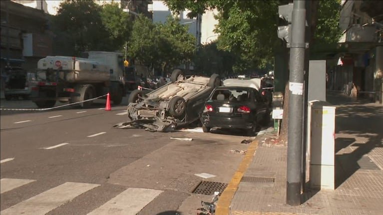 Esta mañana, el barrio porteño de Balvanera fue escenario de un impactante accidente de tránsito. Un conductor colisionó contra dos vehículos y un contenedor de basura, provocando su vuelco en plena avenida Rivadavia.